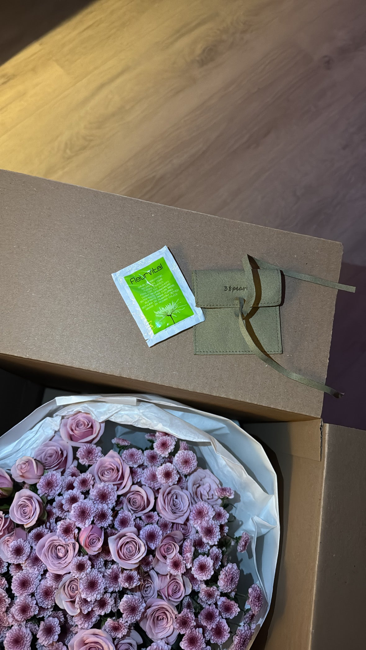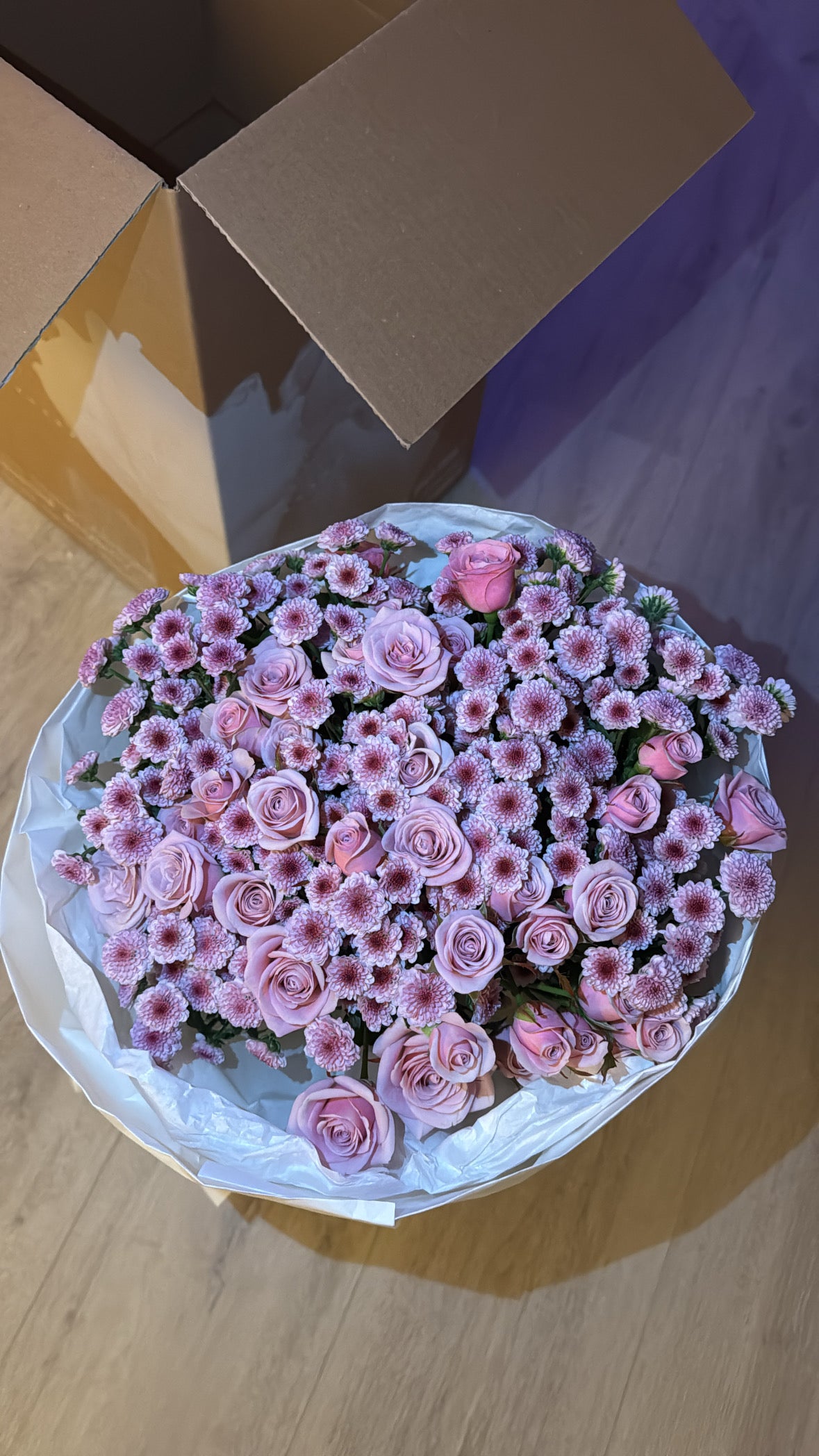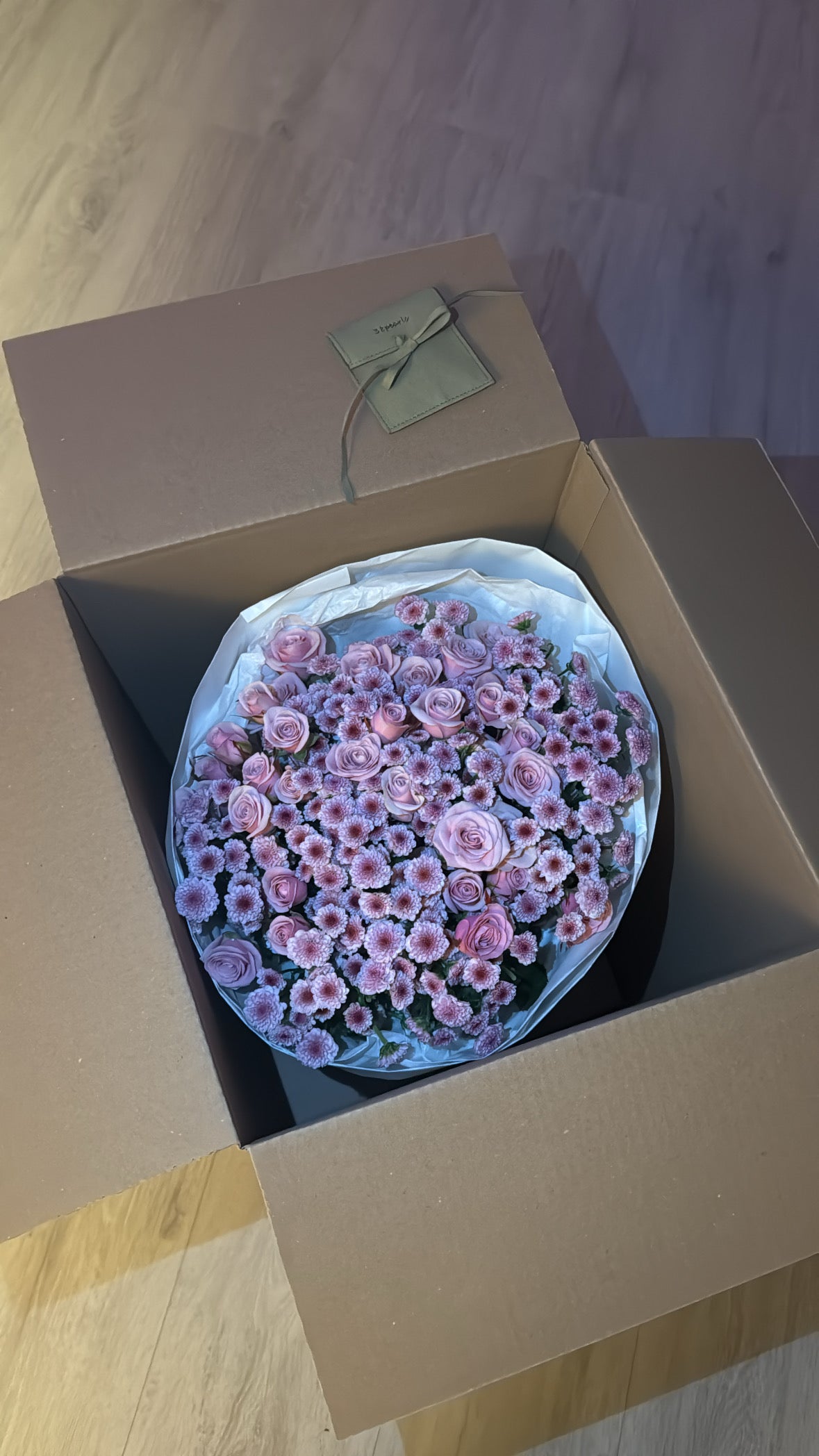 Ein puderrosa Strauß mit 10 Mini-Rosenstängeln und 20 Chrysanthemenstängeln, liebevoll eingewickelt in weißes Seidenpapier und weißes Kraftpapier, wirkt besonders edel und stilvoll. Die zarten rosa Mini-Rosen setzen sanfte Farbakzente, während die weißen Chrysanthemen für einen frischen, klaren Kontrast sorgen. Die Kombination aus den beiden Papiersorten unterstreicht die natürliche Schönheit der Blumen und verleiht dem Strauß eine elegante, gleichzeitig schlichte Note – perfekt für besondere Anlässe oder als liebevolles Geschenk.