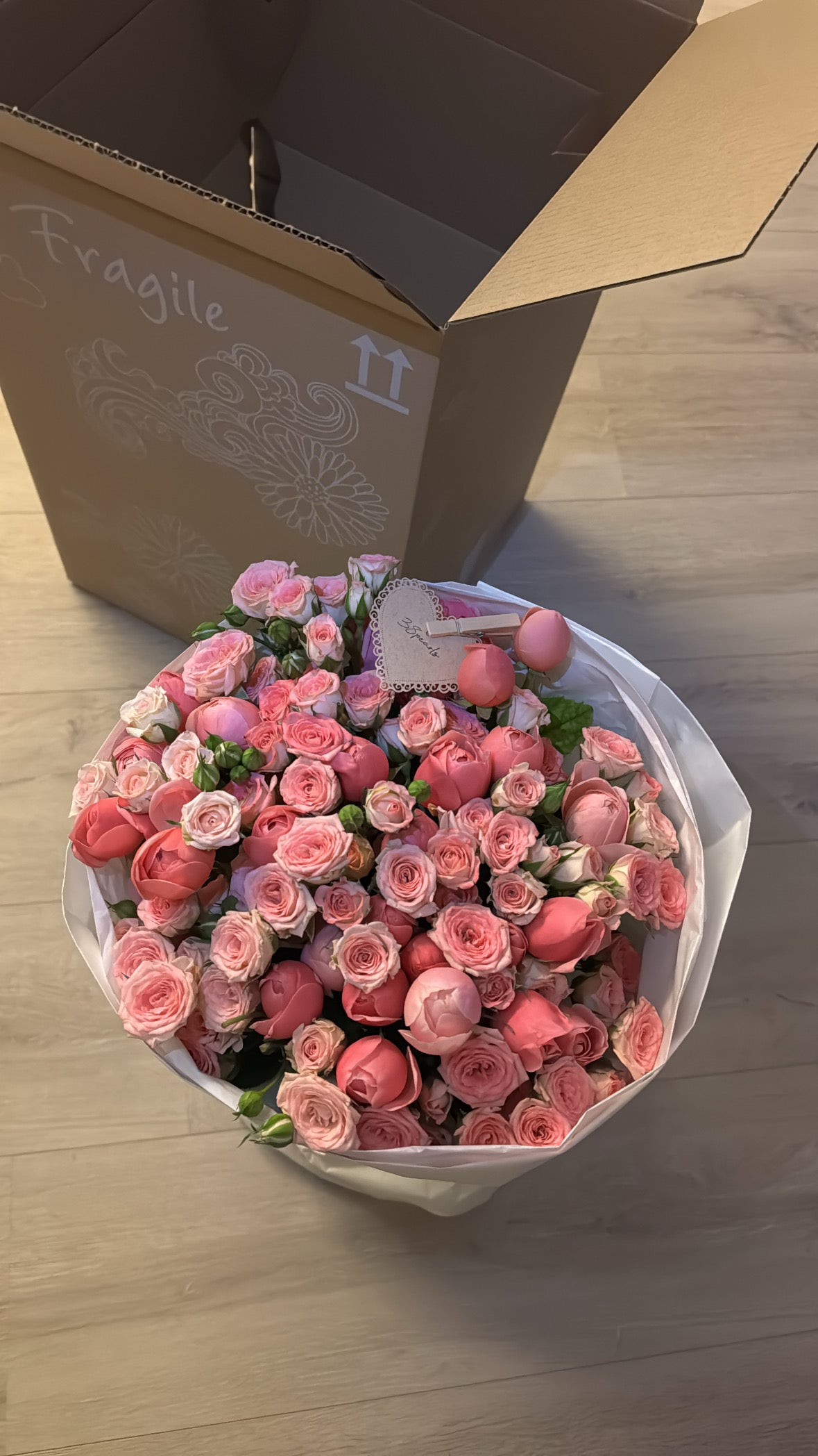 Ein zauberhafter Rosenstrauß, bestehend aus 20 zarten Mini-Rosa Sprayrosen und 10 lebhaften Pinken Sprayrosen, alle mit einer eleganten Länge von 50 cm. Liebevoll in feines weißes Seidenpapier eingehüllt und zusätzlich mit edlem weißem Kraftpapier umwickelt, strahlt dieser Strauß pure Eleganz und Frische aus – perfekt, um jedem Anlass einen Hauch von Romantik und Stil zu verleihen.
